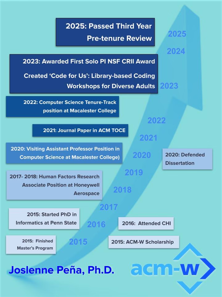 This month, we are catching up with Dr Joslenne Peña, who attended the CHI 2016 on an ACM-W scholarship. Dr Peña is now an Assistant Professor of Computer Science at Macalester College, working at the intersection of computing education and human-computer interaction. In her research, she explores the use of informal learning spaces, such as libraries, as welcoming environments for learning. She designs and evaluates informal coding workshops for middle-aged and older adults in the Saint Paul community. In her current work, she is designing and developing an adult informal learning workshop series called Code for Us. Beyond her research, she is a dedicated mentor and advocate for marginalized students in STEM. She has contributed to teaching and mentoring programs such as iD Tech Camps, iTech Academy, and Code for Her. As a member of the Penn State Graduate School Alumni Society Board of Directors, she helps connect graduate students with alumni for career development, industry insights, and networking opportunities.